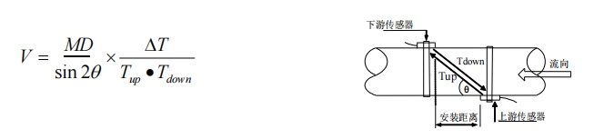 當超聲波束在液體中傳播時,液體的流動將使傳播時間產(chǎn)生微小變化,其傳播時間的變化正比于液體的流速。零流量時,兩個傳感器發(fā)射和接收聲波所雲(yún)的時間完全相同(可實際測量零流量的技術),液體流動時,逆流方向的聲波傳輸時間大于順流方向的聲波傳輸時間。其關系符合下面表達式:
